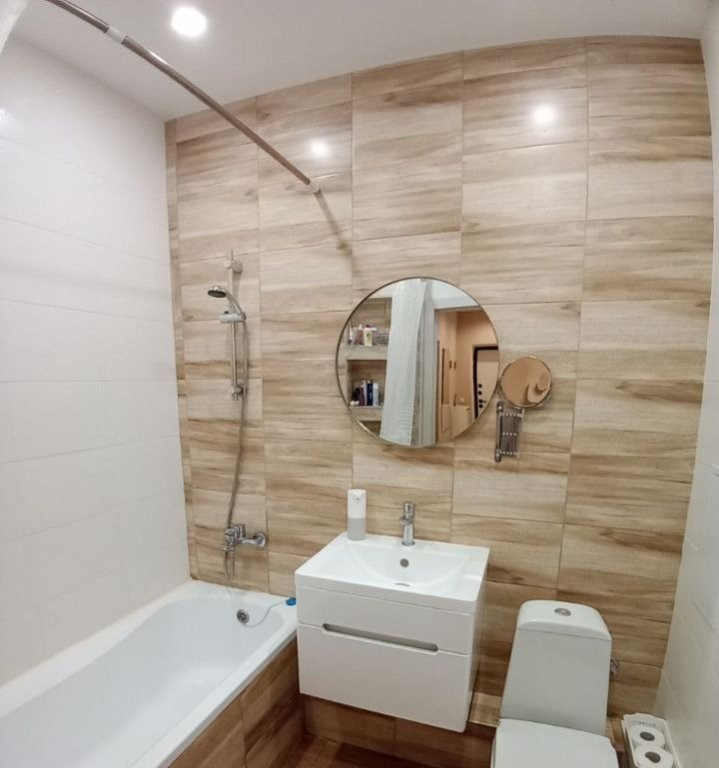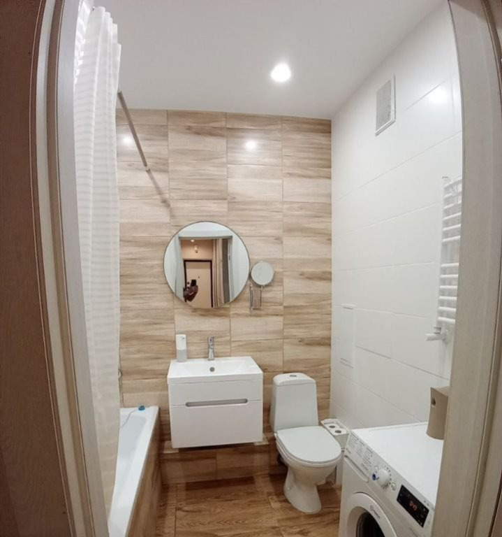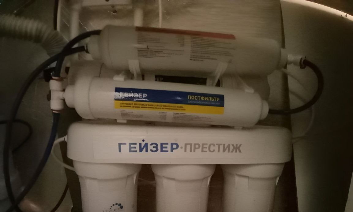 Совмещенный санузел в плитке. Установлен фильтр для питьевой воды, а так же счетчики на газ и воду.